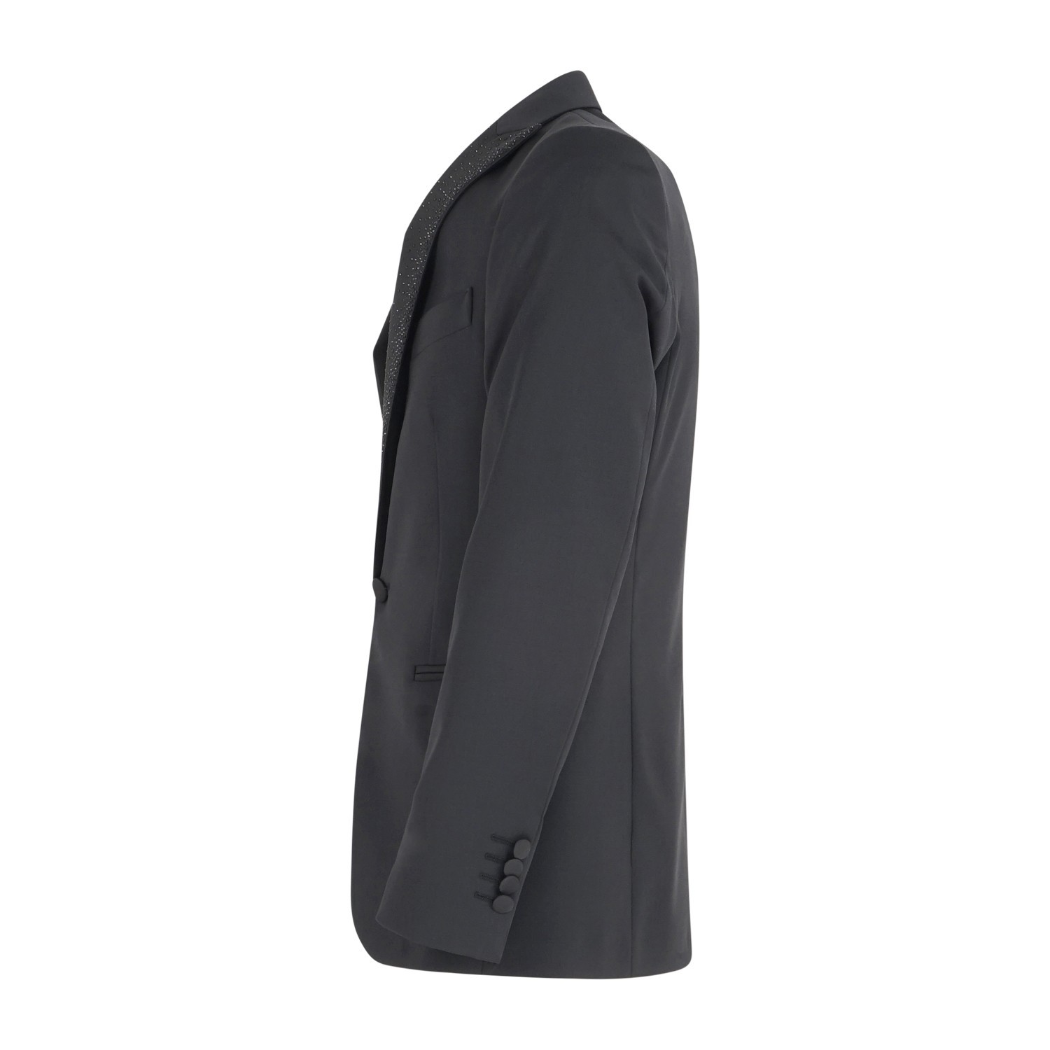 Abito nero monopetto rever con elementi brillanti tono su tono