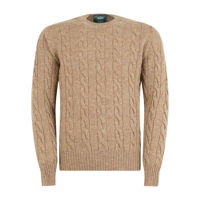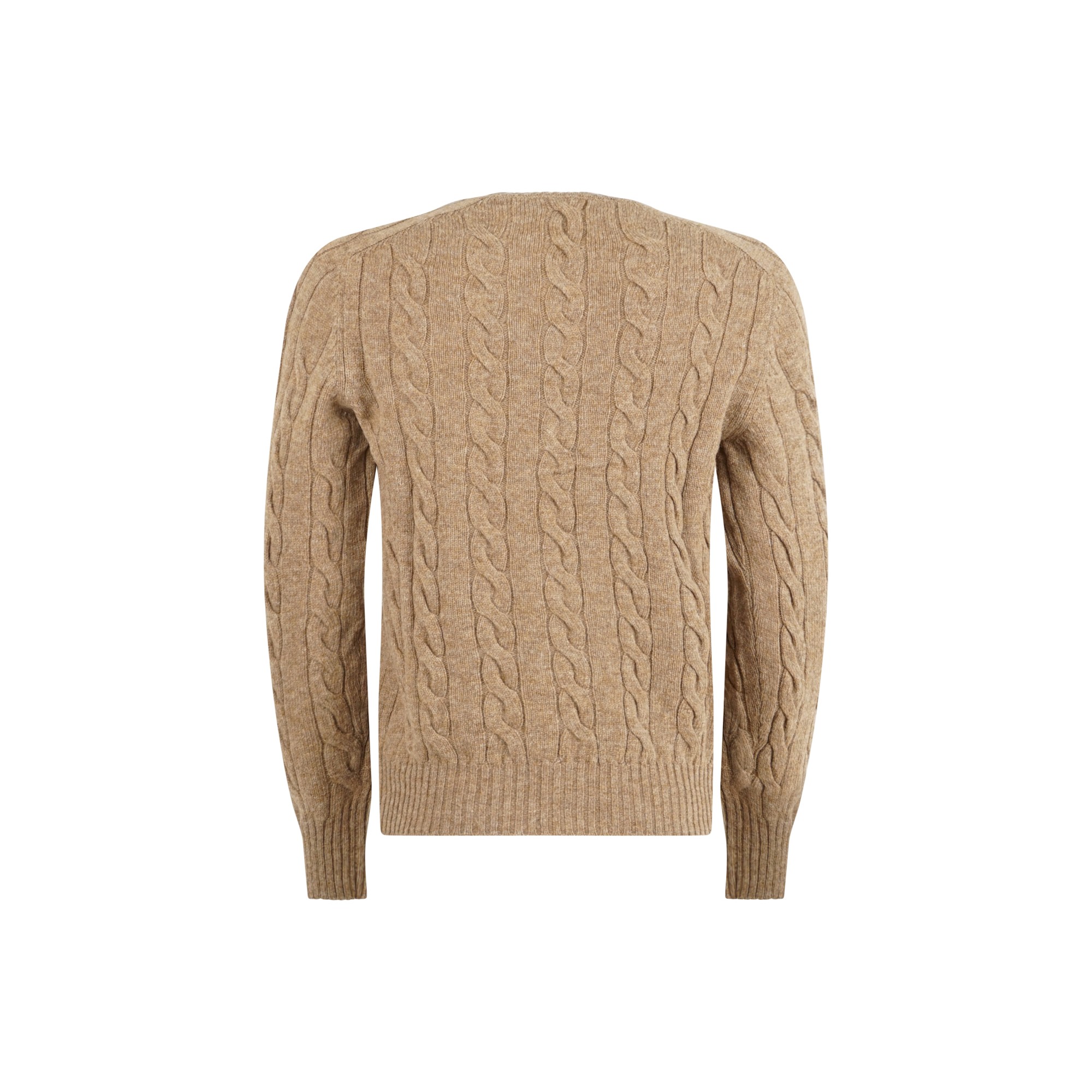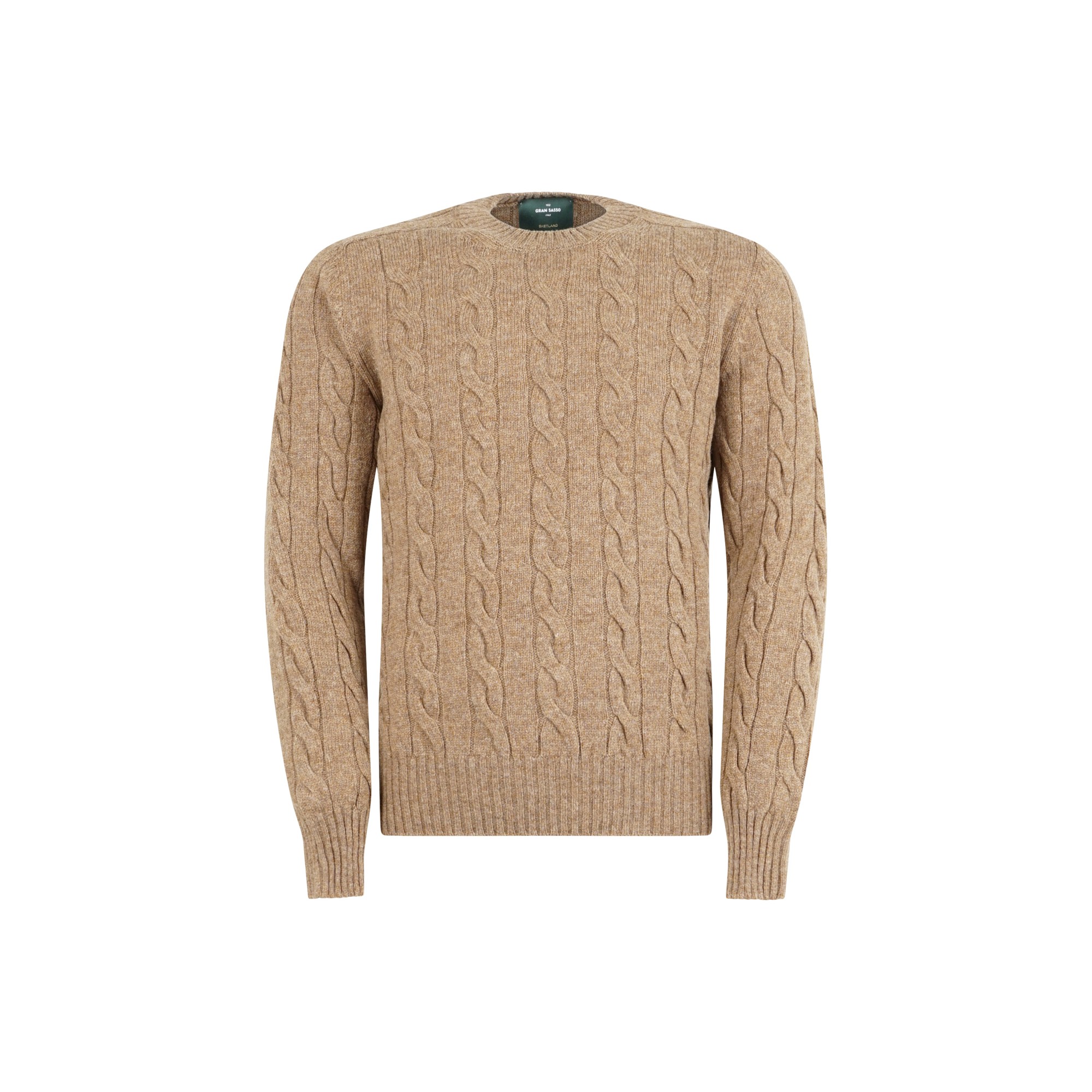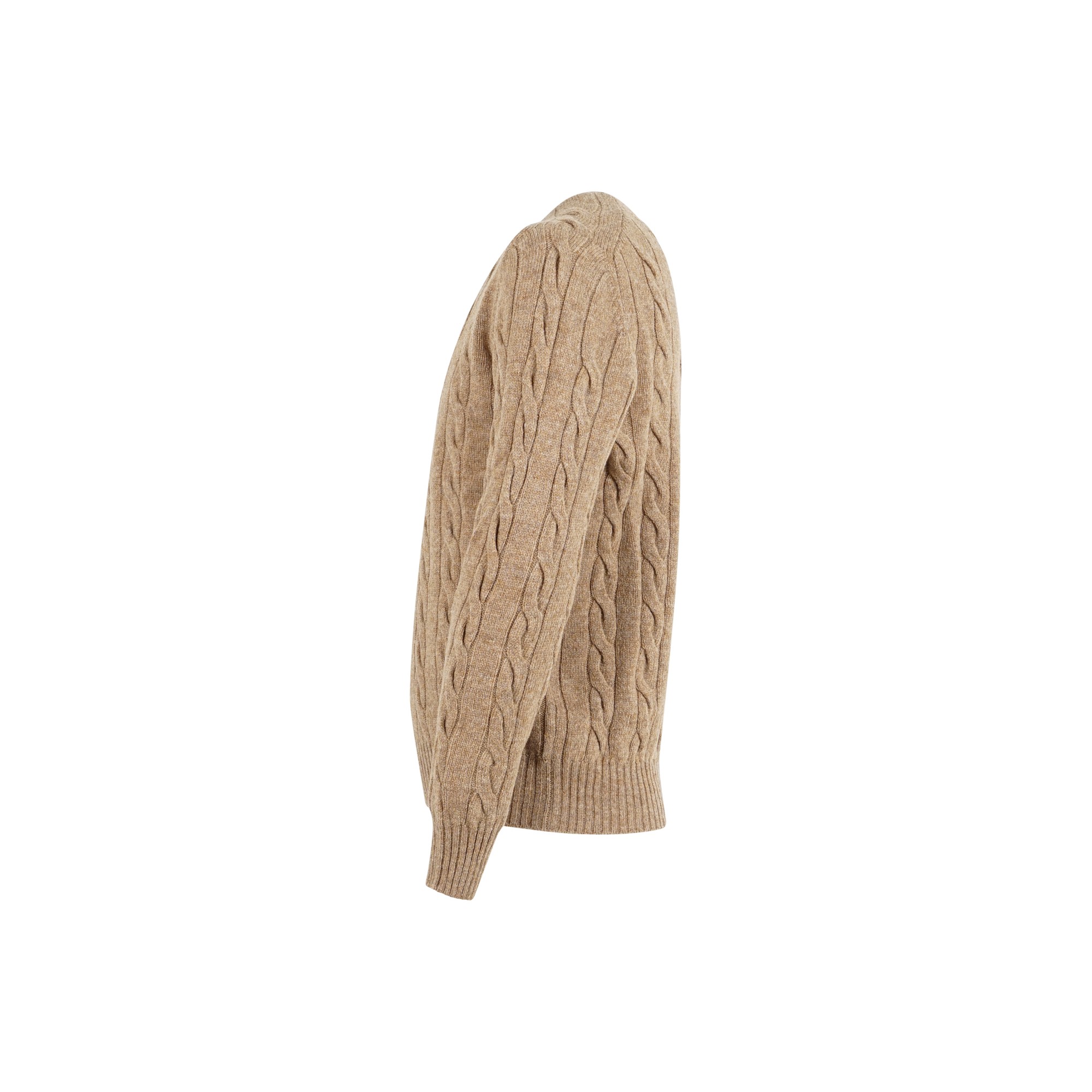 Maglione girocollo beige in pura lana Shetland con lavorazione a treccia