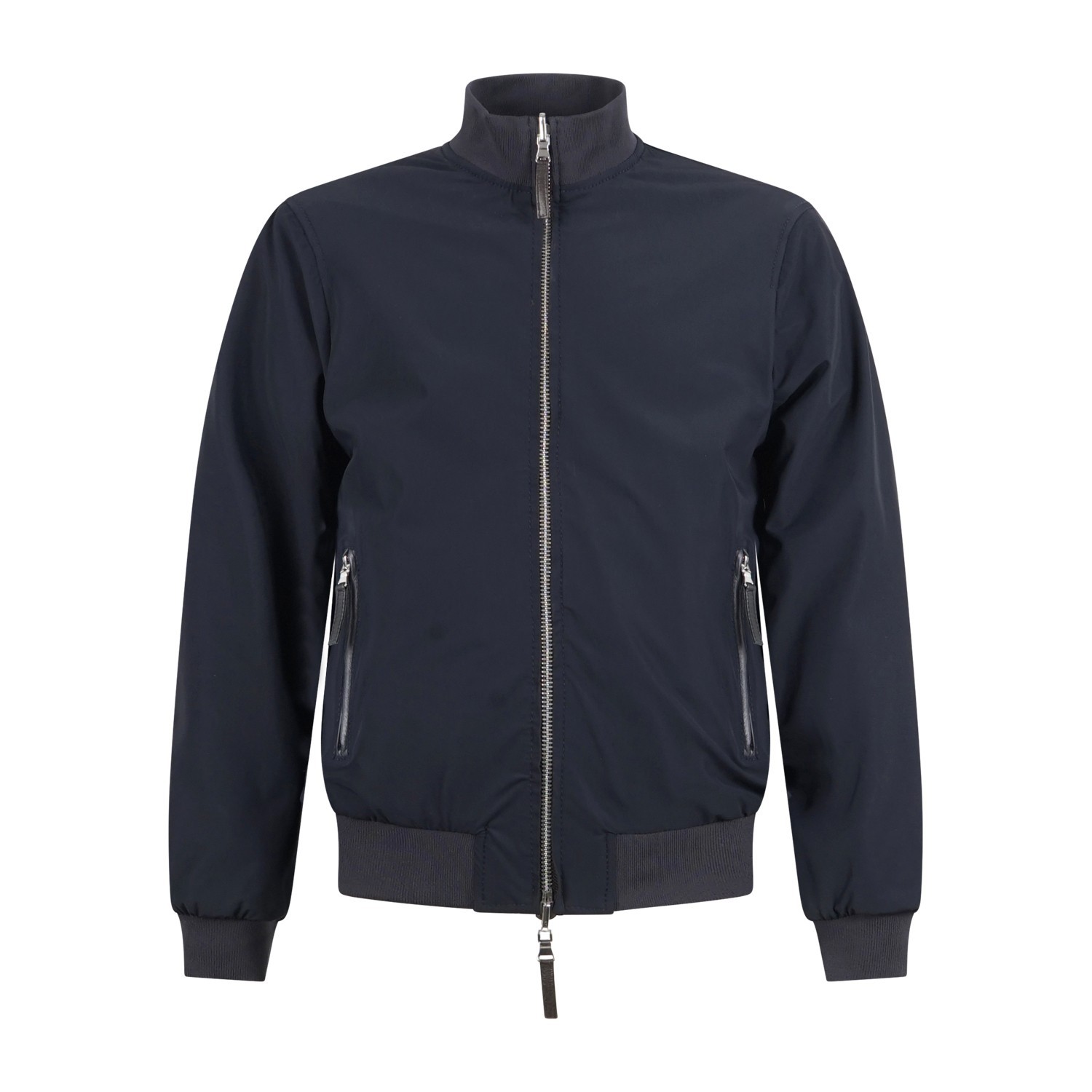 - Dettagli in pelle blu sulle tasche